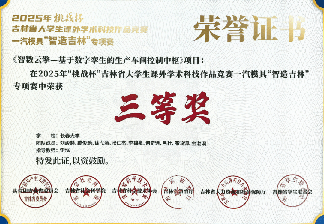 近日,2025年“挑战杯”吉林省大学生课外学术科技作品竞赛一汽模具“智造吉林”专项赛在吉林青年创业园(北湖园区)圆满落幕。我院参赛项目获一等奖1项、三等奖1项。